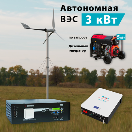 Электростанция ВЭС-3K литий мощность 3 кВт – это надежный и эффективный способ энергоснабжения практически в любом месте, оснащенная различными компонентами для обеспечения надежного и эффективного электропитания в условиях переменных обстоятельств. Этот тип энергетической системы объединяет два источника энергии - ветрогенератор и дизельный генератор, что позволяет обеспечивать стабильное и эффективное электроснабжение.